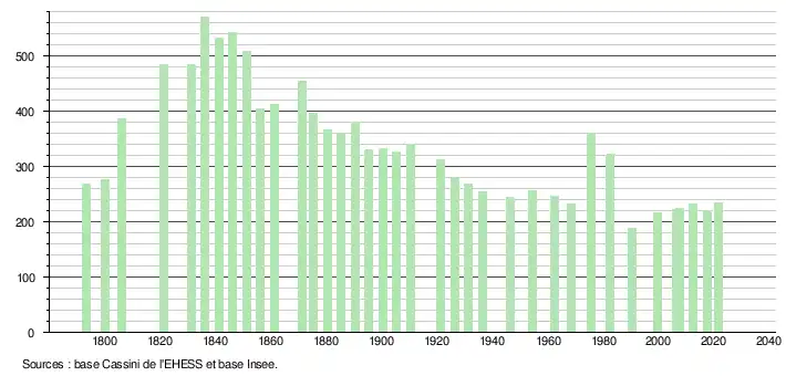 L'évolution du nombre d'habitants est connue à travers les recensements de la population effectués dans la commune depuis 1793. Pour les communes de moins de 10 000 habitants, une enquête de recensement portant sur toute la population est réalisée tous les cinq ans, les populations légales des années intermédiaires étant quant à elles estimées par interpolation ou extrapolation[21]. Pour la commune, le premier recensement exhaustif entrant dans le cadre du nouveau dispositif a été réalisé en 2007[22].