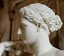 La tête est légèrement tournée vers la droite, mais la déesse ne regarde pas véritablement ce qu'elle fait : le regard porte dans le vague, comme c'est souvent l'habitude pour les statues du second classicisme[4]. Les cheveux ondulés sont ramenés en arrière et retenus par un bandeau noué en haut de la nuque ; leurs extrémités sont rassemblées en une sorte de chignon maintenu par un second ruban invisible.