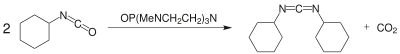 L'équipe de Jiansheng Tang condensent deux isocyanates en utilisant le catalyseur OP(MeNCH2CH2)3N avec un rendement de 92 %[8] :