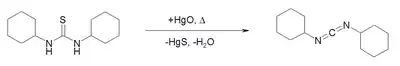 De nombreuses voies de synthèse ont été élaborées, les plus récentes via une réaction de couplage offrent de meilleurs rendements. Historiquement, le DCC fut formé par déshydratation de la dicyclohexyl-urée par le chlorure de paratoluènesulfonyle en présence de triphénylphosphine et triéthylamine comme bases[4]. De la même façon, la dicyclohexyl-thiourée réagit avec l'oxyde de mercure en formant un intermédiaire où l'atome de soufre est échangé par l'oxygène. Sa déshydratation forme alors le DCC[5] :