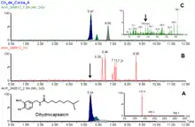 Spectrographie de masse en tandem de la dihydrocapsaïcine (échantillon A) et d'un autre échantillon (B). L'échantillon B confirme que le composé est trouvé dans les poteries préhispaniques du Mexique[4]
