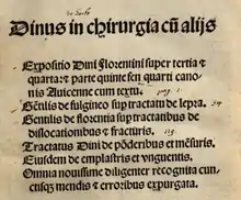 - l’ Expositio super parte quintae Fen quarts Canonis Avicennae, Super IV Fen early Avicennae praeclarissima commentaria , quae Dilucidatorium totius practicae generalis medicinalis scientiae noncupatur et Chirurgia cum tractatu eiusdem de ponderibus et mensuris nec non de emplastris et unguentis[2].
