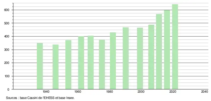 L'évolution du nombre d'habitants est connue à travers les recensements de la population effectués dans la commune depuis 1936. Pour les communes de moins de 10 000 habitants, une enquête de recensement portant sur toute la population est réalisée tous les cinq ans, les populations légales des années intermédiaires étant quant à elles estimées par interpolation ou extrapolation[24]. Pour la commune, le premier recensement exhaustif entrant dans le cadre du nouveau dispositif a été réalisé en 2006[25].