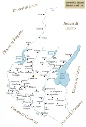 - toutes les municipalités dans la province de Brescia, sauf : dans le sud du lac de Garde, Salò (dernier village du diocèse) à Lonato del Garda et Desenzano del Garda (qui appartiennent au diocèse de Vérone), la municipalité de Paratico qui appartient au diocèse de Bergame ;