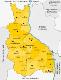 Il possède un territoire d'une superficie de 3 000 km2 divisé en 30 paroisses. Le siège épiscopal est dans la ville de Jericó où est située la cathédrale Notre-Dame-des-Miséricordes. À Jardín se trouve la basilique de l'Immaculée-Conception (es).