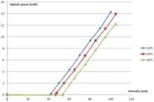 La caractéristique électrique d'une diode laser dépend de la température de la diode. En effet, la population de l'état haut de la diode dépend de la température suivant une fonction de Fermi[1]. La température modifie l'intensité de seuil et translate donc la caractéristique.