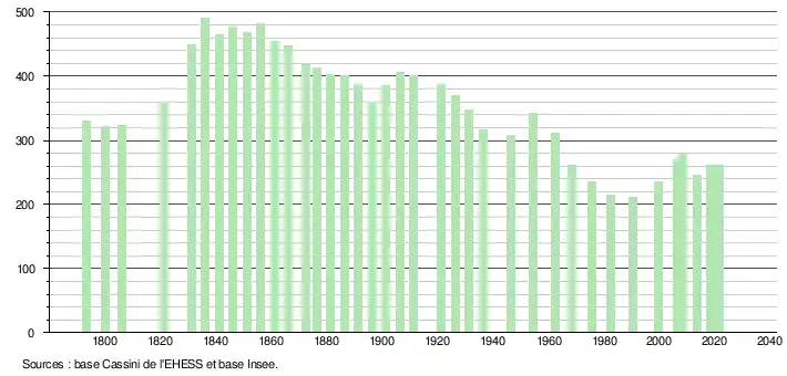 L'évolution du nombre d'habitants est connue à travers les recensements de la population effectués dans la commune depuis 1793. Pour les communes de moins de 10 000 habitants, une enquête de recensement portant sur toute la population est réalisée tous les cinq ans, les populations légales des années intermédiaires étant quant à elles estimées par interpolation ou extrapolation[34]. Pour la commune, le premier recensement exhaustif entrant dans le cadre du nouveau dispositif a été réalisé en 2008[35].