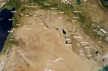 La première moitié du millénaire est la période des royaumes amorrites (v. 2004-1595), qui forment une sorte de koinè aux pratiques politiques similaires de la Mer Méditerranée jusqu'aux contreforts du Zagros[6]. La basse Mésopotamie et la Syrie sont dominées successivement par plusieurs royaumes : dans la première, ce sont d'abord Isin et Larsa qui prennent la succession d'Ur, mais finalement Babylone impose son hégémonie sous Hammurabi (1792-1750) et ses successeurs, alors que l'Élam échoue à affirmer sa domination sur la Mésopotamie ; en Syrie, le royaume dominant est celui de Yamkhad (Alep), qui profite de la disparition de ses voisins Mari et de Qatna (son grand rival) dans le courant des XVIIIe et XVIIe siècles. Les pratiques diplomatiques de cette époque sont surtout documentées par le lot exceptionnel des archives royales de Mari, datant de la première moitié du XVIIIe siècle (correspondance diplomatique, accords politiques, récits historiques)[7], complété par quelques lots d'archives moins importants pour ce domaine (Tell Leilan, Tell Rimah, Kültepe, entre autres).