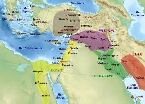 La fin de la période amorrite est marquée par la destruction de ces deux grands royaumes sous les coups des Hittites, qui ont réuni à leur profit les royaumes d'Anatolie orientale dans les dernières décennies du XVIIe siècle. Au même moment, les Hourrites fondent des entités politiques de plus en plus puissantes, qui culminent avec la formation du royaume du Mitanni. À ces deux-là s'ajoute finalement l'Égypte, dont la XVIIIe dynastie fait chuter les Hyksôs, envahisseurs venus quelques décennies plus tôt du Proche-Orient, avant de commencer à se tailler un Empire au Levant, face au Mitanni. On rentre donc dans une nouvelle ère[8], avec des royaumes encore plus grands et plus puissants, et aussi plus divers culturellement et à l'horizon géographique plus élargi. La plupart des anciens royaumes de l'ère amorrite sont devenus les vassaux de ces rois, à l'exception de Babylone, qui reste un royaume important sous les Kassites (1595-1155). Les souverains de ces royaumes dominants se considèrent comme des « grands rois », égaux entre eux. Vers le milieu du XIVe siècle, l'Assyrie remplace le Mitanni dans ce groupe. L'Élam peut également être considéré comme un des grands royaumes de cette période, au moins aux XIIIe et XIIe siècles. Les pratiques diplomatiques de cette période sont connues grâce à plusieurs lots de documents d'une importance exceptionnelle : celui de Hattusha (Boğazköi), la capitale hittite (lettres, accords diplomatiques, chroniques historiques)[9] ; les lettres d'Amarna, en Égypte (correspondance internationale des pharaons Amenhotep III et Akhenaton)[10] ; et les archives royales d'Ugarit, royaume secondaire de Syrie soumis successivement à l'Égypte puis aux Hittites[11]. C'est la période pour laquelle les relations internationales sont documentées par les sources les plus abondantes et les plus diversifiées géographiquement.