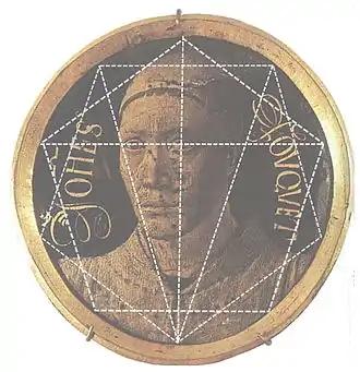 L'organisation du dessin se fonde, comme pour le panneau de la Vierge, sur une géométrie très complexe mise en œuvre par Fouquet. En effet, l'ensemble du portrait peut être circonscrit dans un ensemble de deux pentagones inversés, dont les dimensions sont calculées selon le nombre d'or. Des lignes régulières, perlées de noir, parcourent à plusieurs endroits le visage, le cou et le vêtement du peintre : elles peuvent révéler des signes de ratés au moment de la cuisson de l'émail, mais cela pourrait être aussi des marques liées à l'utilisation du compas du peintre afin de positionner les lettres de son nom. Le visage, pour sa part, est inclus dans un triangle isocèle, dont les deux segments de même longueur longent les deux côtés de la figure. Cette organisation géométrique souligne ainsi l'œil (gauche) du peintre, organe primordial pour son art[a 19].