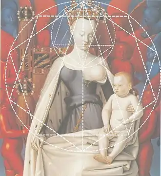 Charles Bouleau est parvenu à déceler l'organisation de la peinture dans l'utilisation de deux pentagones inversés, formant ainsi un décagone inclus dans un cercle. Les dimensions de cet ensemble sont calculées sur la base du nombre d'or. Il encadre ainsi le groupe central, formant un triangle dont les sommets sont formés par le haut de la couronne de la Vierge, sa main à gauche et la jambe de l'enfant à droite et dont l'arête gauche est soulignée par le bord du manteau de la Vierge. Un autre pentagone, plus petit, est formé autour de la tête de la Vierge et circonscrit en partie basse par son buste. Ce dernier ensemble géométrique souligne par deux segments parallèles, toujours calculés à l'aide du nombre d'or, le sommet du dossier du trône ainsi que les extrémités de la couronne. La géométrie utilisée par Fouquet souligne ainsi le caractère royal de la Vierge : c'est à la fois la reine des anges, mais aussi une maîtresse royale, par allusion au modèle supposé[a 8],[10].