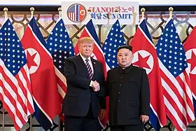 En 2003, la Corée du Nord se retire du TNP. Les tensions sont extrêmes avec les États-Unis en 2016 et 2017 quand la Corée du Nord procède à des essais nucléaires de plus grande puissance et à des lancements de missiles balistiques de portée intermédiaire ou intercontinentale. En 2018, un dégel diplomatique intervient entre les deux Corées et un sommet a lieu à Singapour entre Kim Jong-un et Donald Trump, sans résultat très concret. En février 2019, un nouveau sommet entre les deux dirigeants à Hanoï tourne court lorsque les États-Unis maintiennent leur demande maximaliste que la Corée du Nord abandonne toutes ses installations d'armes nucléaires avant tout allégement des sanctions. Une visite à Panmunjom en juin 2019 ne permet pas de relance du processus, tout comme les pourparlers en Suède durant le second semestre. En décembre 2019, la Corée du Nord déclare que la dénucléarisation est « hors de propos »[25]. La Corée du Nord continue de développer son arsenal de bombes nucléaires et de missiles balistiques, et la Corée du Sud renforce sa défense antimissile en propre et par des moyens déployés par les États-Unis[26],[27],[28].