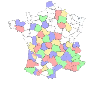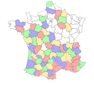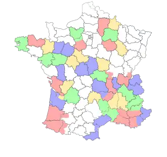 La France métropolitaine est divisée en treize ligues calquées sur les régions françaises, elles-mêmes divisées en 91 districts calqués sur les départements français.