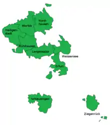 En outre, deux grandes et des nombreuses petites exclaves appartiennent au district d’Erfurt. Ce sont d’une part les arrondissements de Schleusingen dans la forêt de Thuringe et de Ziegenrück dans la Haute-Saale et d'autre part des régions plus petites autour de Mühlberg dans le Gotha, de Benneckenstein dans le Harz (jusqu’en 1932), de Kamsdorf près de Saalfeld, de Blankenberg, de Sparnberg, de Gefell et de Blintendorf à Vogtland dans la Haut-Saale.
