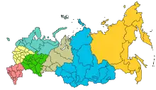 Les 89 sujets fédéraux de Russie sont regroupés dans huit okrougs fédéraux (OF), ou districts fédéraux (en russe : федера́льные округа́, sing. федера́льный о́круг ; transcription française : federalnye okrouga, sing. federalny okroug), administré chacun par un représentant plénipotentiaire du président de la fédération de Russie.
