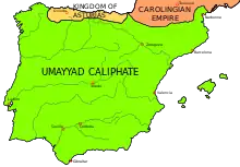 Au début du VIIIe siècle, la péninsule Ibérique est envahie par les « Maures » venus d’Afrique du Nord, récemment conquise par le Califat Omeyyade et convertie à la toute nouvelle religion : l’islam. Ils débarquent dans le sud en 711, commandés par Tariq ibn Ziyad à la tête de 7 000 hommes, remportent la bataille du Guadalete face aux Wisigoths de Rodéric[L 10]. À l’origine de cette bataille, il y a la crise de succession qui divise la noblesse wisigothe. Le gouverneur romain de Ceuta[L 10] qui résistait encore aux omeyyades, s’oppose à l’accession au trône de Rodéric qui avait abusé de sa fille et les musulmans, après une première incursion en 710, décident de profiter de la division des chrétiens. Ce qui n’était au début qu’une simple razzia se transforme alors en invasion. Dès 715, toute la péninsule (à l’exception des Asturies où se réfugient des seigneurs wisigoths) est contrôlée, avec une présence musulmane essentiellement concentrée autour de Cordoue et de Grenade. Abd al-Aziz ibn Musa bin Nusair épouse Egilona, la veuve de Rodéric, revendiquant ainsi la continuité du pouvoir wisigoth.