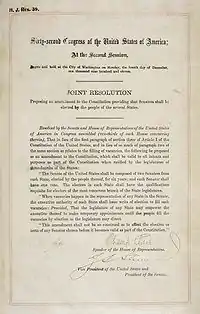 Le XVIIe amendement de la Constitution des États-Unis, adopté en 1913, établit l'élection des sénateurs américains au suffrage universel direct. L'amendement remplace l'article I, § 3, alinéas 1 et 2 de la Constitution, en vertu de laquelle les sénateurs étaient élus par les législatures des États. Il modifie également la procédure de vacance du Sénat, autorisant les législatures des États à permettre à leur gouverneur de faire une nomination temporaire en attendant une élection partielle.