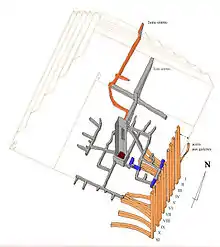 Du côté est de la pyramide, tout près des chambres bleues, onze puits funéraires descendent en ligne droite sur trente à trente-deux mètres, puis dévient à angle droit vers l'ouest. Les fosses I - V ont été utilisées pour l'inhumation des membres de la famille royale ; les fosses VI - XI ont été utilisées comme tombes symboliques pour les tombes des ancêtres royaux des Ire et IIe dynasties. Plus de 40 000 récipients, bols et vases en pierre de toutes sortes ont été trouvés dans ces galeries. Des noms royaux tels que ceux des rois Den, Sémerkhet, Ninetjer et Sekhemib étaient gravés sur ces récipients. On pense aujourd'hui que Djéser a restauré les tombes originales des ancêtres, puis a scellé les objets funéraires dans les galeries pour tenter de les sauvegarder.