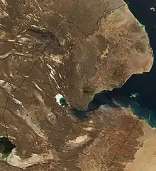 Djibouti bénéficie d'un climat désertique chaud (classification de Köppen BWh). Un climat aride chaud est inhabituel pour des latitudes aussi basses que celle de Djibouti. Les précipitations sont très rares, très faibles, irrégulières et très espacées dans le temps, avec une moyenne annuelle entre 50 et 180 mm qui varie selon les régions du pays. En moyenne, on enregistre entre 5 et 20 jours de pluie par an. Les fortes chaleurs sont constantes et perdurent tout au long de l'année. Les températures moyennes maximales varient de 27 °C durant les mois les plus « frais » à 43 °C durant les mois les plus chauds localement, notamment à Tadjourah. Bien que Djibouti soit un pays désertique et aride, le degré hygrométrique de l'air y est très élevé à cause de la proximité avec la mer et les fortes chaleurs associées à une forte humidité ambiante donnent un ressenti souvent lourd et désagréable. Cependant en s'enfonçant dans les terres, vers l'intérieur du pays, l'air devient plus sec et aussi plus chaud. Durant la saison chaude, un vent très chaud, très sec et parfois poussiéreux, le khamsin, souffle une cinquantaine de jours et est responsable de l'augmentation brutale des températures maximales (souvent supérieures à 45 °C)[28]. Le ciel est généralement clair avec une durée moyenne annuelle d'ensoleillement variant entre 3 200 et 3 600 heures avec une assez faible variation mensuelle. Le climat y est chaud, sec et ensoleillé toute l'année. Le climat désertique de Djibouti est très particulier du fait de sa proximité de l'équateur, ainsi la saisonnalité est réduite et les amplitudes thermiques journalières et annuelles sont anormalement basses pour un tel climat. Cependant, les endroits à altitudes élevées comme Randa par exemple bénéficient d'un climat moins chaud et surtout moins aride que les basses altitudes : celles-ci bénéficient d'un climat semi-aride chaud (classification de Köppen BSh) avec des précipitations supérieures à 250 mm par an et des températures maximales de 23 °C durant les mois les plus « frais » à 37 °C durant les mois les plus chauds.