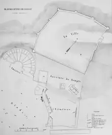 Dès la seconde moitié du IVe siècle av. J.-C., le sanctuaire est entouré d'une enceinte qui prolonge dans la vallée les fortifications de l'acropole (plan no 1) et englobe le sommet de la petite colline (d'altitude 350 m) qui domine le site. Construite en appareil isodome, l’acropole était le refuge fortifié de la cité. Protégé par dix tours quadrangulaires, elle était accessible par deux entrées, l’une au nord-est et l’autre au sud-est. Elle possédait une citerne pouvant alimenter les habitants en eau en cas de siège. À partir des angles sud-ouest et sud-est de l’acropole, deux courtines descendaient dans la vallée pour inclure le sanctuaire. Trois portes y étaient percées, dont deux à l’est et au sud (hors plan), protégées par des tours. La porte ouest (plan no 19) fut déplacée vers l'ouest (no 18) lors de l’agrandissement du sanctuaire, au début du IIIe siècle av. J.-C. On dégageait ainsi un espace suffisant pour la construction du Bouleutérion (no 4) et du Prytanée (no 6). La nouvelle courtine occidentale (no 17) les contournait pour rejoindre un bâtiment identifié à la maison des prêtres (no 5).