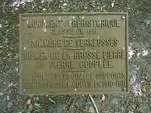 Ces efforts sont récompensés par le classement du dolmen au titre des monuments historiques dès le [9]. Léon Coutil fait alors apposer près du mégalithe une plaque mentionnant le classement du dolmen et son redressement[1].
