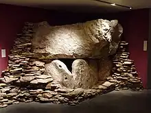 La chambre funéraire fut recouverte d'une monumentale table de couverture en calcaire mesurant 4,75 m de longueur, 2,60 m de largeur pour une épaisseur moyenne de 1,40 m, dont le poids est estimé à 39 tonnes. Elle reposait à l'origine sur neuf orthostates (quatre sont encore visibles) dont la surface interne fut égalisée par martelage et abrasion Certaines dalles comportent des rainures d'emboîtement entre deux piliers consécutifs. Les plus grands orthostates mesurent 2,30 m de hauteur et leur poids est estimé à environ 2 tonnes. La chambre a une forme polygonale. Le sol était dallé. Elle débouche à l'est sur couloir (7,60 m de long ouvrant au sud-est) dont elle était peut-être isolée par une porte constituée d'une grande dalle actuellement visible côté nord[5].
