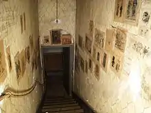 Autre originalité du château, Léon de Brondeau a collé sur les murs de l'escalier intérieur de nombreuses caricatures (années 1870-1906), issues de L'Assiette au beurre, du Grelot, de L'Esclave ivre, etc., des dessins et reproductions de tableaux. Les thèmes abordés, que l'on retrouvait parfois sur les assiettes en façades, sont la politique, l'anticléricalisme et la séparation de l'Église et de l'État, ainsi que des questions sociales contemporaines et toujours d'actualité comme le mariage et ses inconvénients, l'homosexualité, la prostitution, etc. Parmi les dessinateurs et caricaturistes, figurent André Laclotre, Emile Colh, Gustave Frison, Edmond Lavrade, Jules Grandjouan et André Gill, dont les caricatures issues de la revue Les Hommes d'aujourd'hui sont reprises sur une série de six assiettes scellées en façade.