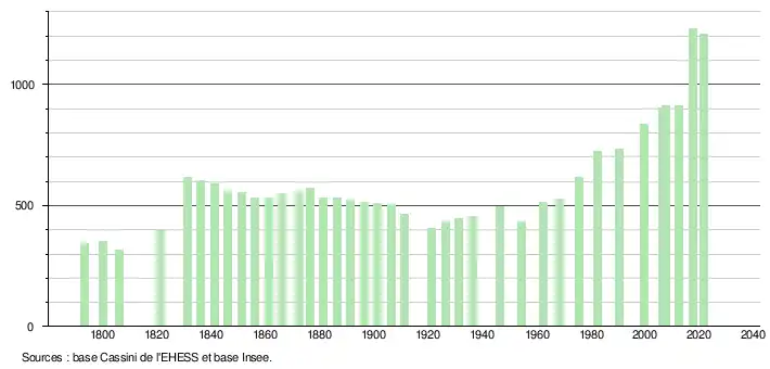 L'évolution du nombre d'habitants est connue à travers les recensements de la population effectués dans la commune depuis 1793. Pour les communes de moins de 10 000 habitants, une enquête de recensement portant sur toute la population est réalisée tous les cinq ans, les populations légales des années intermédiaires étant quant à elles estimées par interpolation ou extrapolation[17]. Pour la commune, le premier recensement exhaustif entrant dans le cadre du nouveau dispositif a été réalisé en 2007[18].