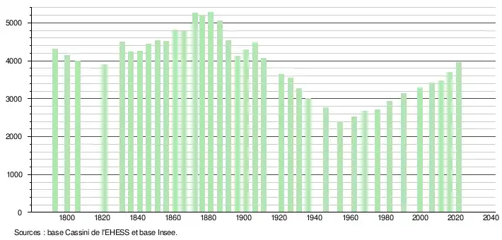L'évolution du nombre d'habitants est connue à travers les recensements de la population effectués dans la commune depuis 1793. Pour les communes de moins de 10 000 habitants, une enquête de recensement portant sur toute la population est réalisée tous les cinq ans, les populations légales des années intermédiaires étant quant à elles estimées par interpolation ou extrapolation[40]. Pour la commune, le premier recensement exhaustif entrant dans le cadre du nouveau dispositif a été réalisé en 2006[41].