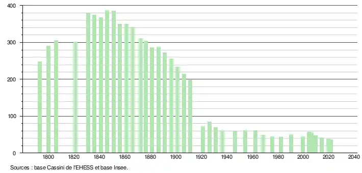 L'évolution du nombre d'habitants est connue à travers les recensements de la population effectués dans la commune depuis 1793. Pour les communes de moins de 10 000 habitants, une enquête de recensement portant sur toute la population est réalisée tous les cinq ans, les populations légales des années intermédiaires étant quant à elles estimées par interpolation ou extrapolation[17]. Pour la commune, le premier recensement exhaustif entrant dans le cadre du nouveau dispositif a été réalisé en 2004[18].
