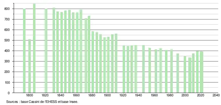 L'évolution du nombre d'habitants est connue à travers les recensements de la population effectués dans la commune depuis 1793. Pour les communes de moins de 10 000 habitants, une enquête de recensement portant sur toute la population est réalisée tous les cinq ans, les populations légales des années intermédiaires étant quant à elles estimées par interpolation ou extrapolation[17]. Pour la commune, le premier recensement exhaustif entrant dans le cadre du nouveau dispositif a été réalisé en 2005[18].