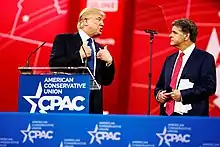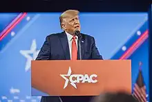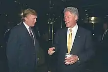 En 2005, Donald Trump se définit comme un « mix » de démocrate et de républicain[193]. En 2008, il contribue au financement de la campagne pour l'investiture démocrate de Hillary Clinton[194]. Durant la campagne présidentielle, il déclare que George W. Bush aurait dû être destitué en raison de la guerre en Irak mais, fervent partisan du Parti républicain, soutient John McCain, dont il assure qu'il « ferait un grand président »[195].