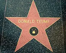 En 2004, Trump devient le producteur exécutif et l'animateur de l'émission de téléréalité The Apprentice, diffusée sur NBC et dans laquelle des candidats s'affrontent pour obtenir un poste de cadre supérieur dans l'une des sociétés du groupe Trump. Les candidats sont tour à tour éliminés du jeu par Donald Trump lui-même, dont la phrase fétiche dans l'émission est « You're fired! » (Vous êtes viré !). La première année de The Apprentice rapporte à Trump 50 000 dollars par épisode (soit environ 700 000 dollars pour l'ensemble de la saison) mais, du fait du succès de l'émission, il est ensuite payé un million par épisode. L'émission donne également lieu à un spin-off, The Celebrity Apprentice[169]. Elle vaut en outre à Trump de recevoir en 2007 son étoile sur le Hollywood Walk of Fame pour sa contribution au divertissement télévisuel[170],[171]. Trump anime quatorze saisons de The Apprentice, de à . En 2016, son étoile du Hollywood Walk of Fame est vandalisée pendant sa campagne présidentielle[172].