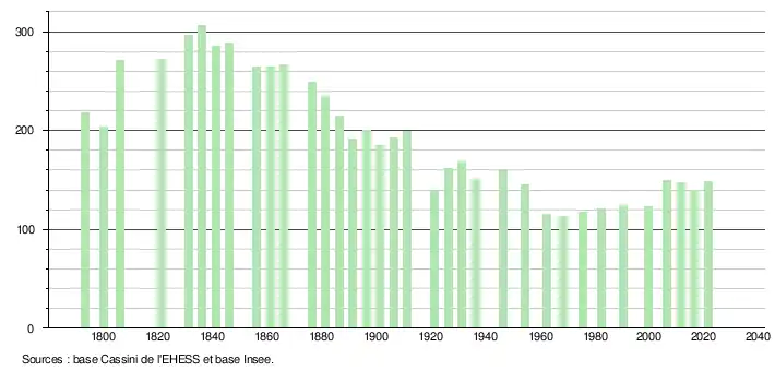 L'évolution du nombre d'habitants est connue à travers les recensements de la population effectués dans la commune depuis 1793. Pour les communes de moins de 10 000 habitants, une enquête de recensement portant sur toute la population est réalisée tous les cinq ans, les populations légales des années intermédiaires étant quant à elles estimées par interpolation ou extrapolation[23]. Pour la commune, le premier recensement exhaustif entrant dans le cadre du nouveau dispositif a été réalisé en 2006[24].