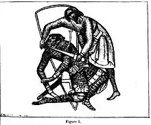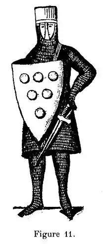 Si on en juge par divers fragments de sculpture, trouvés sur les claveaux d’une port, dans les démolitions, ses armes auraient été représentées par six fesans (?), dont un en pointe ; mais il y a doute. En tout cas, nous reconstituons le bas-relief, aussi exactement que possible, par la figure 11. À la date de 1188, le cartulaire de Champagne mentionne un Fulco de Roé, qui pourrait bien être le même que Fulcone de Courmenant.