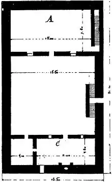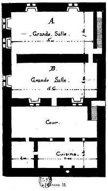L’ancien gîte intérieur fut remplacé par un bâtiment A et B de 16 mètres de profondeur qu’on adossa à la muraille septentrionale du quadrilatère, et l’escalier qui devait le desservir dut être rétabli dans la muraille à l’est. Ce bâtiment élevé d’un rez-de-chaussée et d’un étage sous sol, se composait de 2 salles à chaque section horizontale.