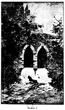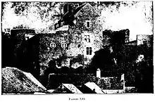 La muraille à l’ouest au-devant de la cour, sapée par sa base, tomba dans le ravin et roula jusqu’au bord du vieux chemin ; mais elle ne fut que découronnée vers son milieu, de sorte que les baies des croisées caractéristiques du XIe siècle ne furent pas entièrement détruites.