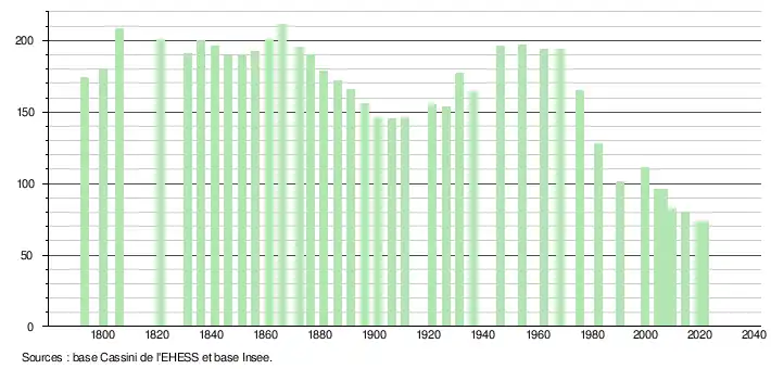 L'évolution du nombre d'habitants est connue à travers les recensements de la population effectués dans la commune depuis 1793. Pour les communes de moins de 10 000 habitants, une enquête de recensement portant sur toute la population est réalisée tous les cinq ans, les populations légales des années intermédiaires étant quant à elles estimées par interpolation ou extrapolation[16]. Pour la commune, le premier recensement exhaustif entrant dans le cadre du nouveau dispositif a été réalisé en 2004[17].