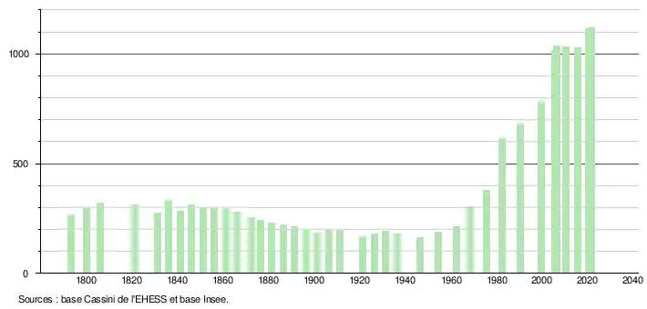 L'évolution du nombre d'habitants est connue à travers les recensements de la population effectués dans la commune depuis 1793. Pour les communes de moins de 10 000 habitants, une enquête de recensement portant sur toute la population est réalisée tous les cinq ans, les populations légales des années intermédiaires étant quant à elles estimées par interpolation ou extrapolation[30]. Pour la commune, le premier recensement exhaustif entrant dans le cadre du nouveau dispositif a été réalisé en 2005[31].
