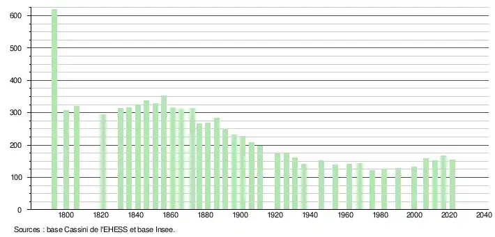 L'évolution du nombre d'habitants est connue à travers les recensements de la population effectués dans la commune depuis 1793. Pour les communes de moins de 10 000 habitants, une enquête de recensement portant sur toute la population est réalisée tous les cinq ans, les populations légales des années intermédiaires étant quant à elles estimées par interpolation ou extrapolation[15]. Pour la commune, le premier recensement exhaustif entrant dans le cadre du nouveau dispositif a été réalisé en 2006[16].