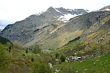 Vue du hameau de Friburge (premier plan) et du village de Champagny le Haut (second plan) baignés par le Doron de Champagny et dominés par la pointe de la Vélière.