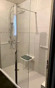 - la douche doit se faire au niveau du sol ou, si cela n'est pas possible pour des raisons techniques, un receveur extra-plat avec des propriétés antidérapantes et la possibilité d'ajouter une rampe d'accès ;