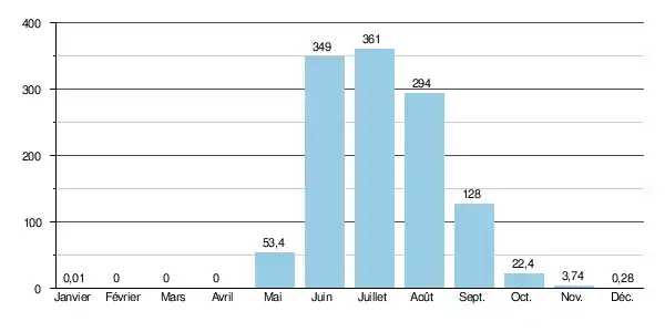 Le débit moyen mensuel observé de février à avril (minimum d'étiage) est de 0,00 m3/s, avec arrêt total de l'écoulement, tandis que le débit moyen du mois de juillet se monte à 361 m3/s), ce qui souligne l'amplitude extrêmement élevée des variations saisonnières. Sur la durée d'observation de 44 ans, le débit mensuel maximal s'est élevé à 874 m3/s en .
