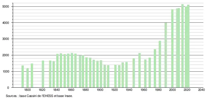 L'évolution du nombre d'habitants est connue à travers les recensements de la population effectués dans la commune depuis 1793. Pour les communes de moins de 10 000 habitants, une enquête de recensement portant sur toute la population est réalisée tous les cinq ans, les populations légales des années intermédiaires étant quant à elles estimées par interpolation ou extrapolation[34]. Pour la commune, le premier recensement exhaustif entrant dans le cadre du nouveau dispositif a été réalisé en 2008[35].