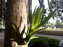 Les feuilles rassemblées à l’extrémité des branches, sont sessiles, en forme d'épée, de 30-100 x 2-5 cm, à base rougeâtre enveloppant complètement l'internœud.
