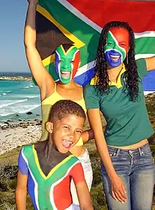Cependant, ce drapeau d'Afrique du Sud, consensuel au sein des deux communautés blanches, hormis auprès d'une frange radicale et minoritaire de la population afrikaner et auprès d'une frange progressiste, devint avec le temps un symbole de l'apartheid (1948-1991) au côté du Springbok et de l'hymne national Die Stem van Suid-Afrika, bien qu'il soit en fait antérieur d'une vingtaine d'années à la période d'application de ces lois[3]. Tous ces symboles relevaient de l'histoire des Blancs d'Afrique du Sud, aucun ne représentait la majorité noire de la population.