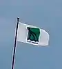 - Du haut d'un carré vert descend une ligne bleue qui se divise en trois, bordant deux îles, avant d'aboutir au fleuve en forme de vagues.