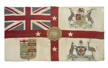 L'année suivante, en 1901, une proposition fut faite par un canadien écrivant à la St James's Gazette (en). Depuis la Confédération, le Canada utilisait les armoiries en quartiers de ses provinces fondatrices comme insigne national à utiliser sur les drapeaux[26]. Il a été observé que l'entrée du Manitoba dans la fédération avait pour résultat que ses armes étaient ajoutées à l'insigne par les fabricants de drapeaux à travers le pays. L'article spéculait que la fédération de l'Australie aboutirait à la conception d'un drapeau similaire avec les armoiries de ses États et qu'une « évolution ininterrompue » d'emblèmes uniques provenant de toutes les colonies formeraient finalement un seul drapeau de l'Empire[27].