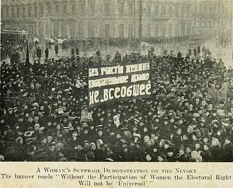 La revendication du droit de vote pour les femmes est portée également par les partis révolutionnaires, notamment sociaux-démocrates. La première et la seconde conférence de l'internationale socialiste des femmes (Stuttgart en 1907 et Copenhague en 1910) ont inscrit le droit des votes des femmes dans leurs objectifs[4]. Le parti-ouvrier social démocrate de Russie, depuis son second congrès (1903), revendique une égalité légale et politique complète pour les femmes, mais cherche à se démarquer du mouvement libéral et du féminisme « bourgeois » et du mouvement libéral. Il a soutenu les manifestations organisées pour la journée internationale des femmes, notamment en 1913, 1914 et 1917[5].