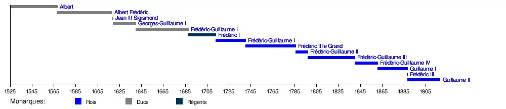 |  | Albert-Frédéric de Prusse 1553-1618 | Maison de Hohenzollern | Albert Frédéric de Prusse fut le second duc de Prusse de 1568 à 1618. À sa mort, le duché échut à son gendre Jean Sigismond de Brandebourg. La marche de Brandebourg et le duché de Prusse ne formèrent plus qu'un seul fief que l'on nommera le Brandebourg-Prusse. | ||